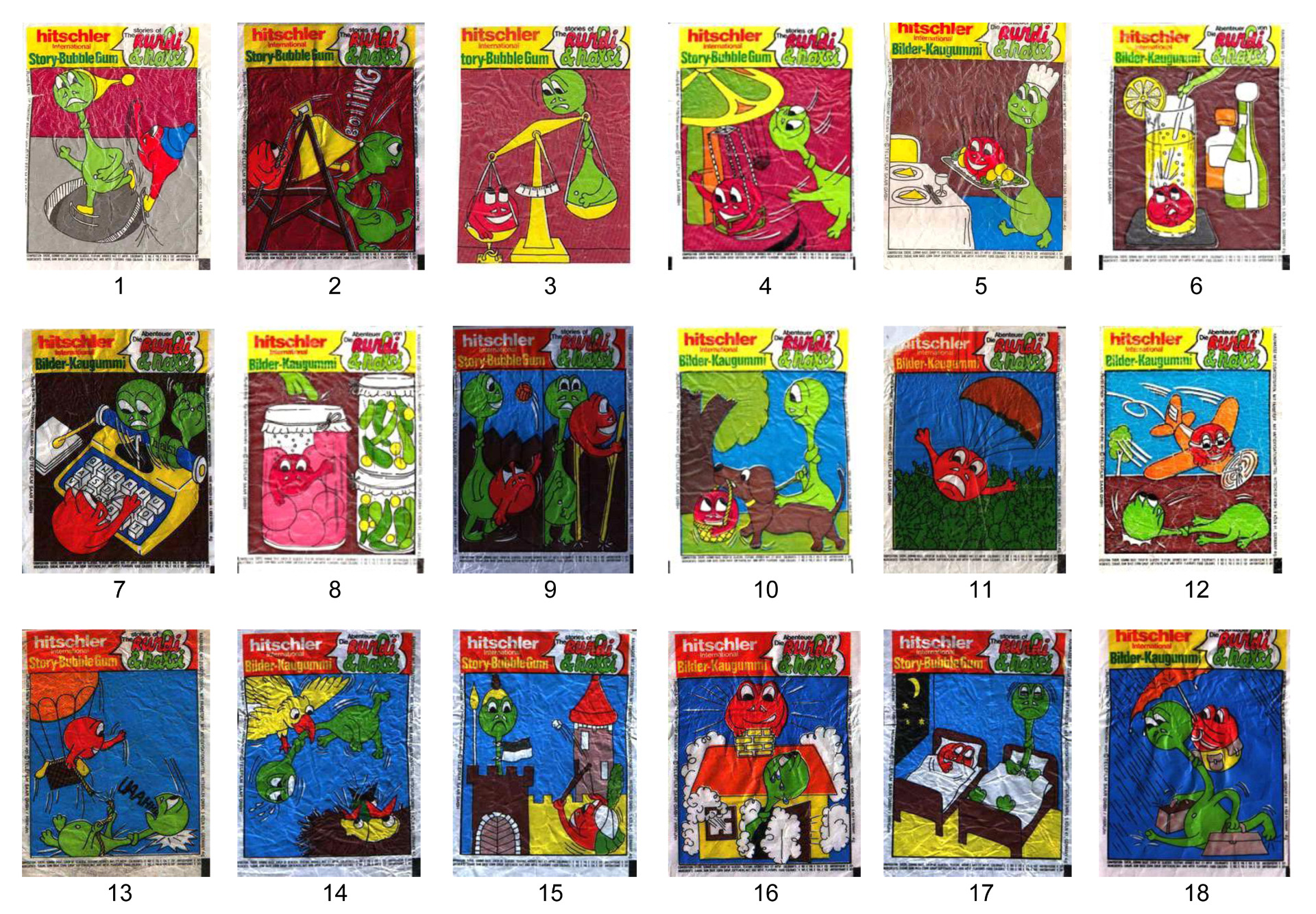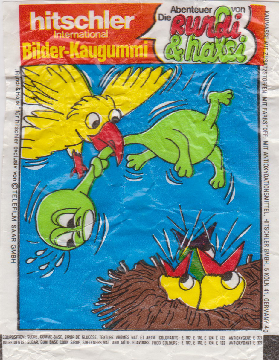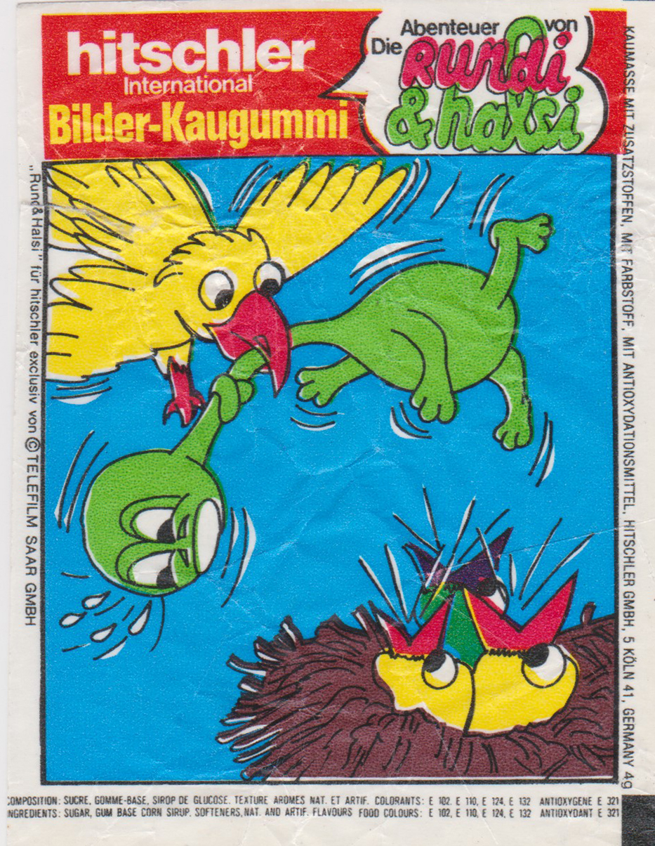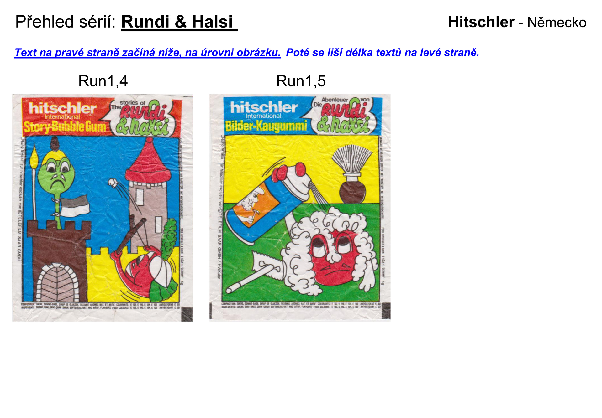 Dokončil jsem třídění obalů Rundi & Halsi ze žvýkaček německé firmy Hitschler. Zatím vím jistě, že obaly existují v pěti variantách, lišících se texty na okrajích obalů. Víc variant jsem ve sbírce nenašel.